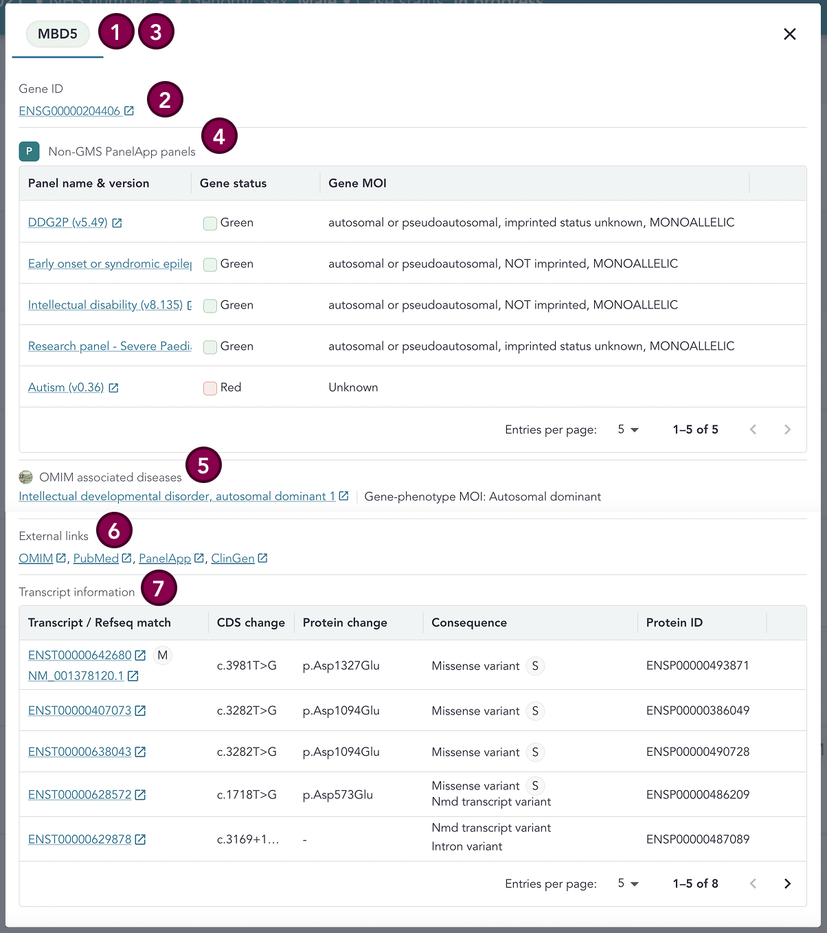 | 6 | Links | Linkouts to external resources and databases for the gene (OMIM, PubMed, PanelApp, ClinGen) |
